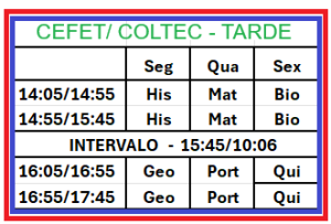 2ª feira – 4ª feira e 6ª feira 14:05 as 17:45 – 4 aulas de 50 minutos